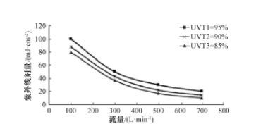 判斷一個(gè)設(shè)備廠家提供的紫外消毒設(shè)備方案其消毒性能是否滿足工程的設(shè)計(jì)要求,關(guān)鍵是看其方案所能實(shí)現(xiàn)的照射到微生物上紫外能量的多少,即紫外劑量是否滿足消毒目標(biāo)的設(shè)計(jì)要求。紫外劑量的計(jì)算方法很多,其中唯一被世界各地包括我國(guó)法規(guī)標(biāo)準(zhǔn)制定和執(zhí)行部門認(rèn)可與接受的就是生物驗(yàn)定劑量方法。這個(gè)方法是在一定測(cè)試條件(工況)下,通過(guò)對(duì)微生物進(jìn)出紫外消毒設(shè)備前后存量濃度的變化反推,得到設(shè)備在該測(cè)試條件下能夠傳遞的有效紫外劑量(即設(shè)備的實(shí)際劑量),然后改變測(cè)試條件(通常是設(shè)備處理的流量、水質(zhì)),即可得到該設(shè)備在不同工況下的紫外劑量曲線,如圖1所示。